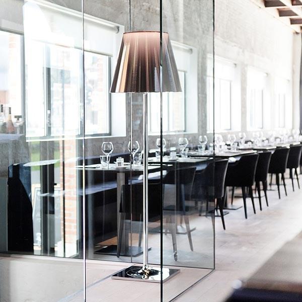 Floor lamp providing diffused lighting; a switch located near the diffuser allows for 4-level light adjustment via a 'remote” dimmer positioned on the power cord near the plug. Base and rod support in die-cast, polished and chrome-plated Zamak alloy. Rod, arm support, arm and diffuser support in polished aluminum tube. Molded steel counterweight with galvanized finish. Injection-molded PC (polycarbonate) inner diffuser opal color. Outer diffusers in transparent or fumèe PMMA (polymethylmethacrylate) and silver or bronze on the inner surface, by vacuum aluminum coating. Injection-molded PC (polycarbonate) upper ring, completely transparent, or transparent brown for the outer bronze diffuser. 'Never leave two Miss K on their own, they reproduce… but thanks to the miracle of the evolution, they evolve into something better: Ktribe” Philippe Starck