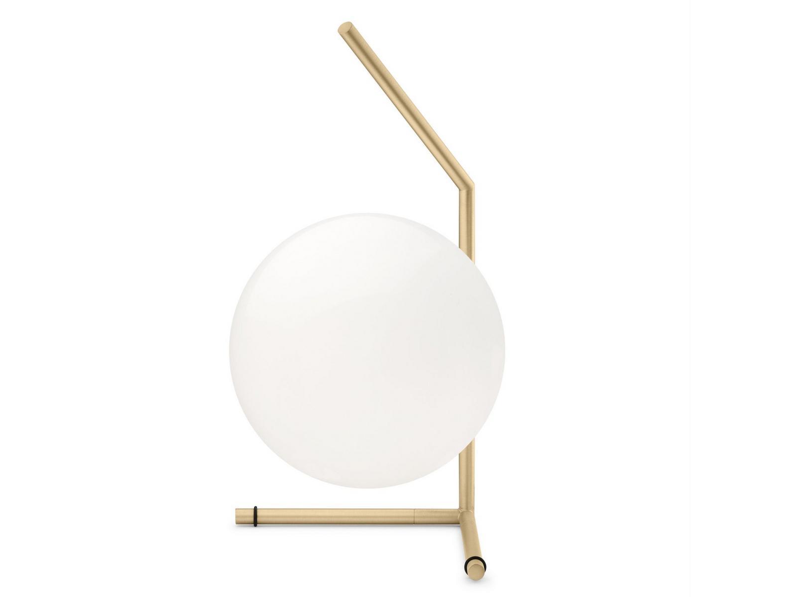 IC LIGHTS T1 Low - Table lamp providing diffused light. Dimmer on the power chord. Version: Low - H 381 mm Frame: brass brushed and transparent varnished. Diffuser: blown glass opal. This collection explores balance. There is a series of lights: table lights, wall lights, ceiling pendants and ceiling mounted lights which take as their basic form a sphere that is perfectly balanced on the edge of a rod. I came across an online video clip of a contact juggler. He was spinning a set of spheres, moving them around on his arms and edge of his fingers. And as I got mesmerized by the magic of his skill, suddenly the spheres look perfectly still. I wanted to capture that exact moment. This was my starting point. The initials IC come from the codes that English police use to define the perceived ethnicity of a person they stop in the street when reporting back to the station. IC1 means white person or Northern European type, IC2 means Mediterranean European/Hispanic, IC3 indicates an African/Afro-Caribbean person, and so on, so this is a playful story to define the different designs. Michael Anastassiades