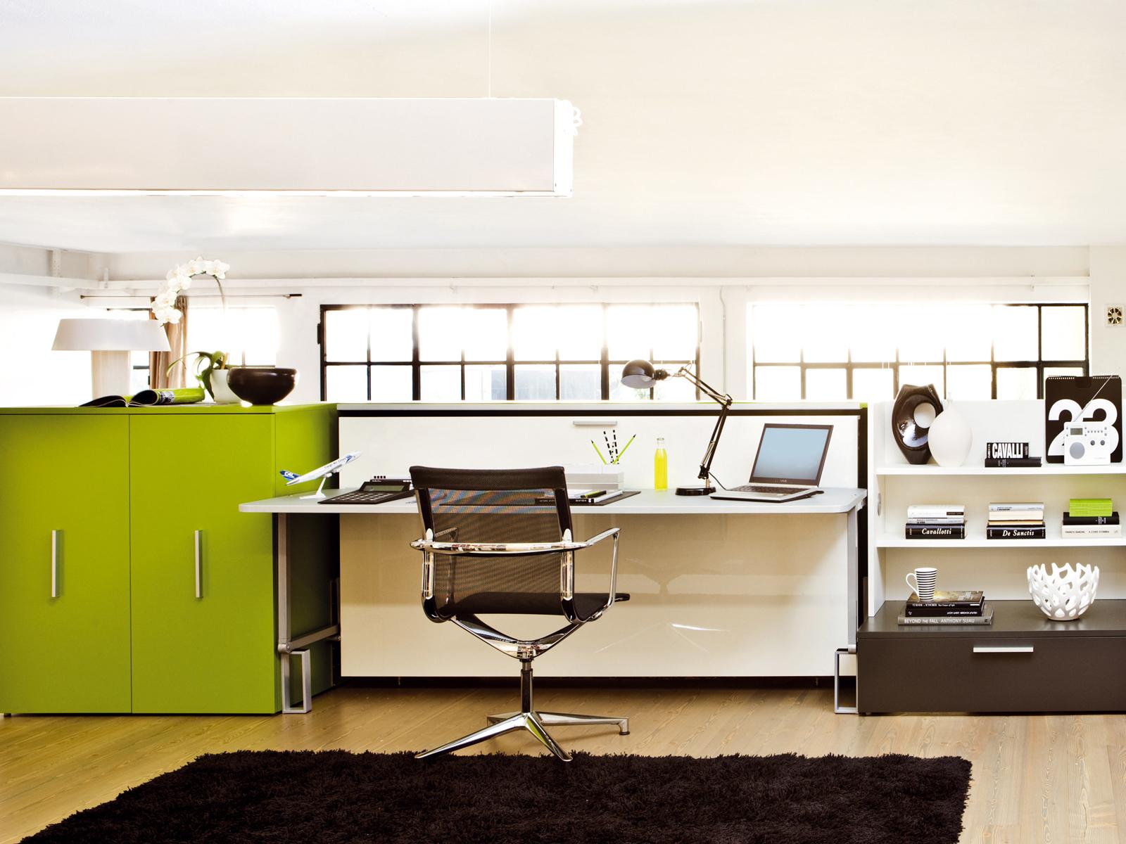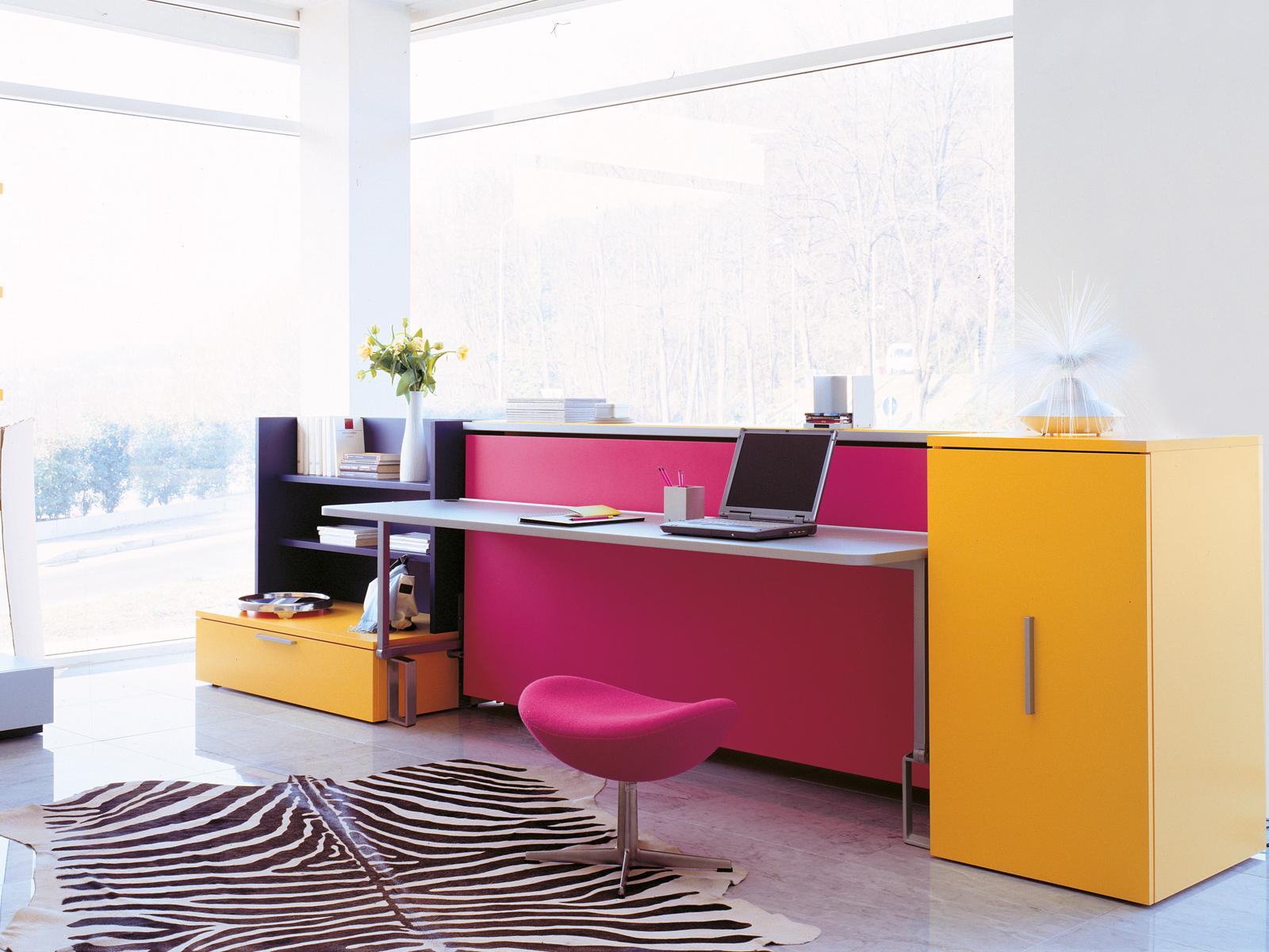 CABRIO IN is a transforming system for studying/working purposes, it can be integrated into the Living & Young System modular programs. The system is composed of a wide lifting up writing desk and a single bed. By a simple movement it transforms into the night configuration without removing any objects from the top. The system is completed by floor cabinets and wall units either with or without door, which can be combined and are available in various sizes.